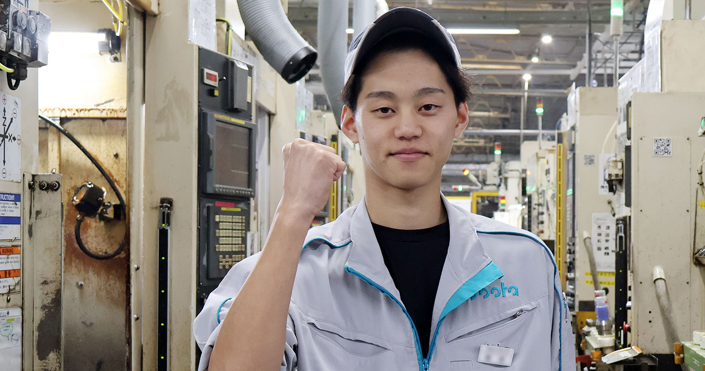 - 祖母が農業を営んでいたことから、幼少期より農業が身近な存在でした。その経験を通じて、「自分の手で作ったトラクタで、祖母をはじめとする農業に携わるすべての人の役に立ちたい」という夢を抱くようになりました。高校で求人票を見た際、多くの企業がある中で、その夢を実現できるのはクボタしかないと確信し、迷わず応募しました。内定が決まったときは、家族全員がとても喜んでくれて、たくさん褒めてもらったことを今でも鮮明に覚えています。