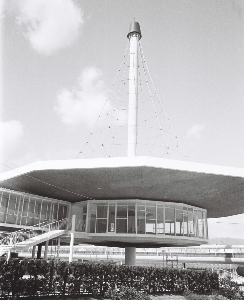 シンボルタワーでは、Gコラム(遠心力を利用して管状に形成された継目なしの鋼管)を利用したモノポール構造を採用。1本の柱からワイヤーロープで大屋根とガラス張りのスカイルームが吊り下げられており、雨や日差しをしのぐ憩いの場所としてお客さまに利用されました。