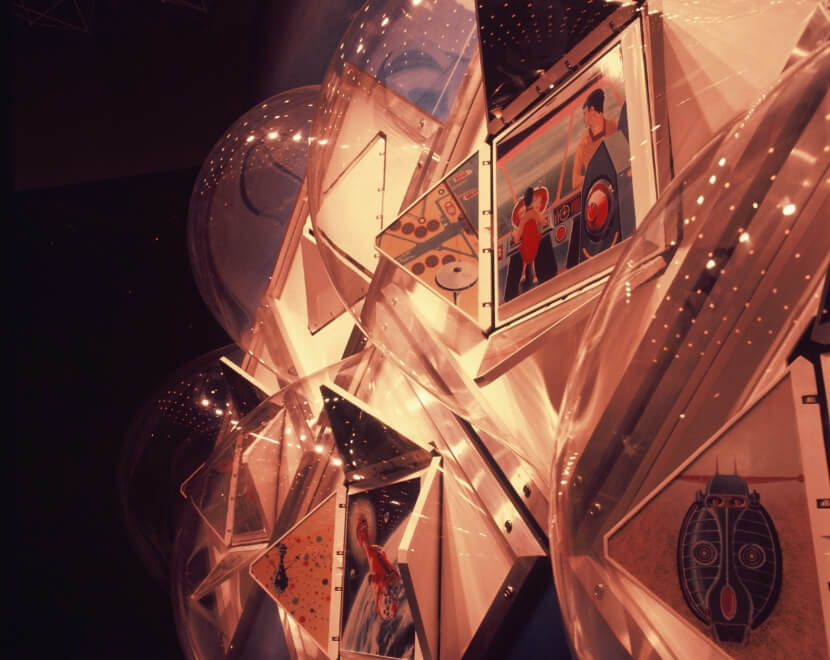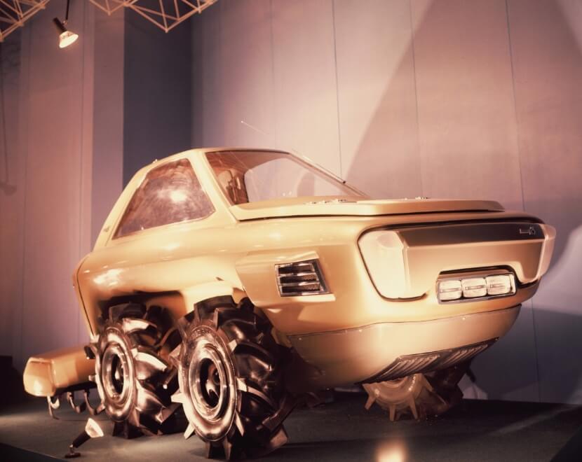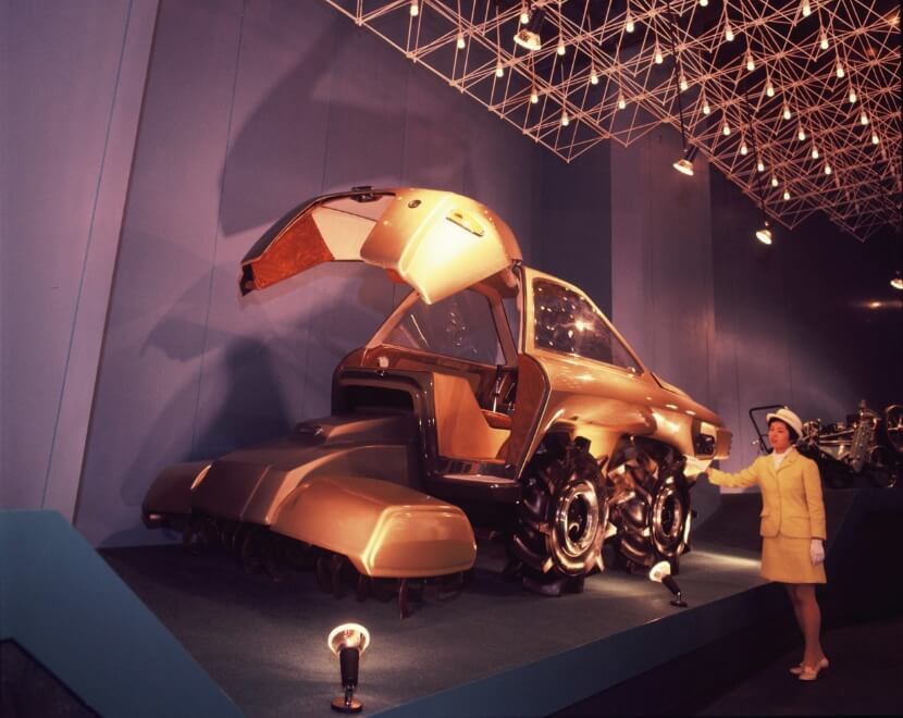 展示壁面の反対側には、久保田鉄工株式会社(現・株式会社クボタ)が開発した「夢のトラクタ」が陳列されました。スポーツカーを思わせるデザインで、科学技術の進歩が未来の農業に寄与する姿を表現。第3壁面のスペースだけでなく、屋外の休憩所にも展示されました。夢のトラクタの高い機能性や乗り心地の良さ、シンプルな操作性などは、現在のクボタ製品にも活かされています。