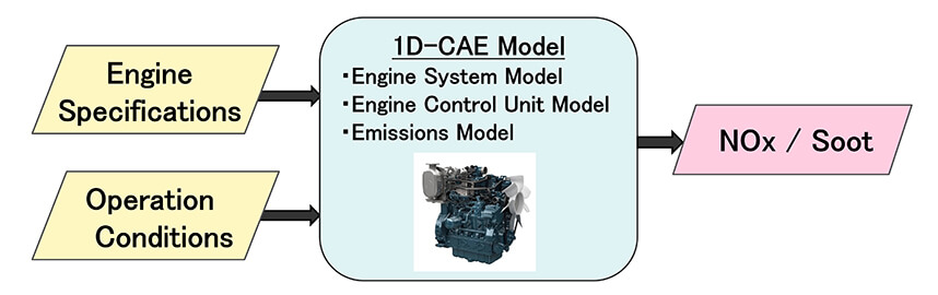 オフロードディーゼルエンジンに対する排出ガス規制は年々強化されており、従来の試作・試験を繰り返す開発手法では膨大な工数を要する。そこで、排出ガス試験サイクルをシミュレーションで模擬し、規制対象成分であるNOx/Sootの排出量を予測する技術を開発した。また、エンジン・ECU・排出ガスモデルを統合した1D-CAE(一次元シミュレーション)モデルを構築し、任意の運転条件におけるエンジン挙動を再現した。特に物理モデルの構築が困難なSootについては、機械学習を組合せることで予測を可能にした。