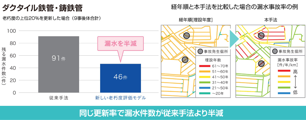 漏水事故率(件/年/km)で定量的に算出することで未来の漏水リスクを見える化します。