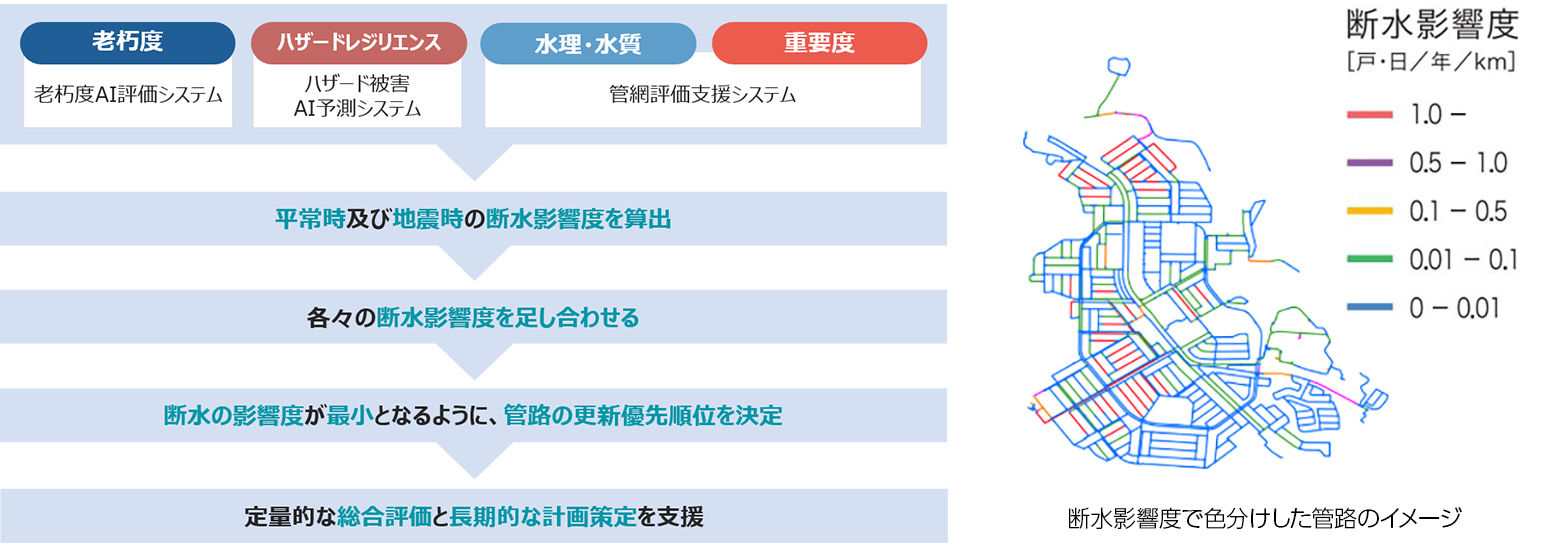 - このたび当社は、水道管路の更新において、「断水影響度」という観点に着目し、効果的な優先順位付けをするための2つの技術を業界で初めて開発しました。断水影響度が高い順に水道管路の更新優先順位付けをすることで、水道事業体は限られた予算の中で断水による市民生活への影響を最小限に抑えることが期待できる更新計画の策定が可能になります。