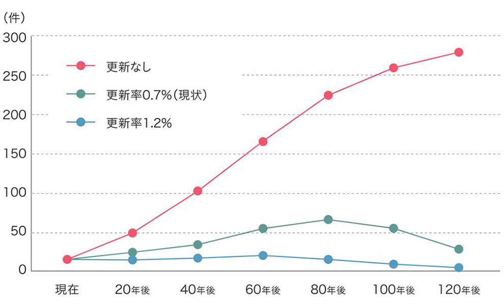 - 更新率などの更新条件を変えて将来の事故件数や耐震化率を予測し、適切な更新条件を提案可能