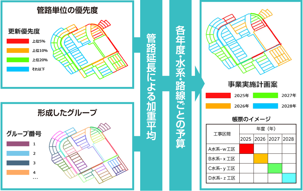 管路の更新優先度を工事区間単位に置き換えることで、適切な事業実施計画案を策定可能