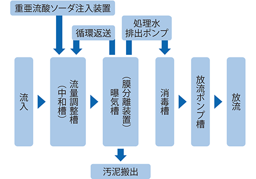 - 流入部に中和槽を設け、後段の生物処理を阻害する恐れのある滅菌成分を中和します。
