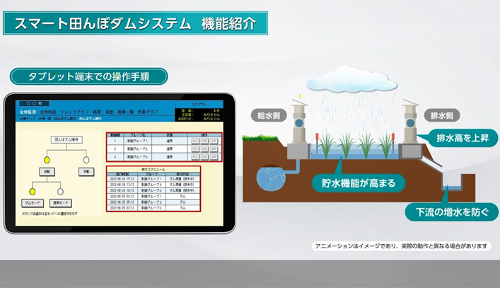 自動給水・排水栓WATARASを遠隔操作し農地や下流域の浸水被害のリスクを低減する取り組み「スマート田んぼダムシステム」を紹介しています。