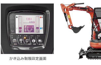 アタッチメントに応じて、アームのかき込み位置を標準バケット・平爪の 2 モードに切り替え可能。アームのかき込み量を自動制限し、平爪バケット装着の場合もブームシリンダの破損を防ぎます。