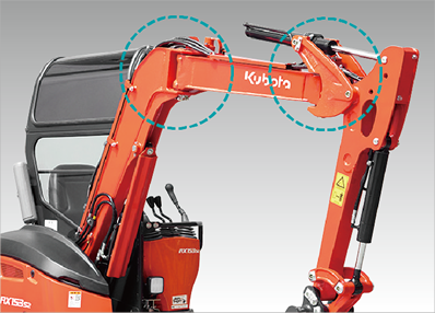 作業中に大きな負荷のかかるブームの両端、走行モータサポートに鋳鋼材を使用。また、フロント支点部は大径フロント支点ピンにより強化しています。