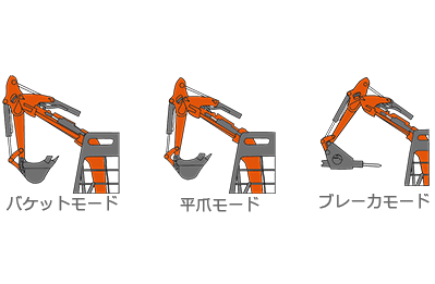 アタッチメントに応じて、アームのかき込み位置を標準バケット・ブレーカ・平爪の3モードに切り替え可能。