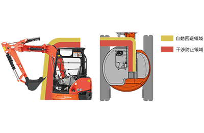バケットが運転室に衝突しないよう、干渉領域に入る前に、ブームが止まることなく滑らかに運転室を回避します。