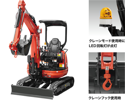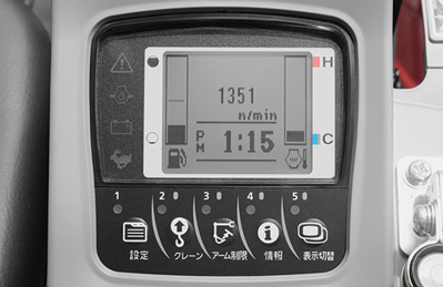 クレーンモード時には、エンジン回転数が自動的に吊り作業に適した回転数になります。過負荷時には、ブザーと警告ランプと同時に、液晶モニタでも警告内容を表示するので、素早く対応できます。